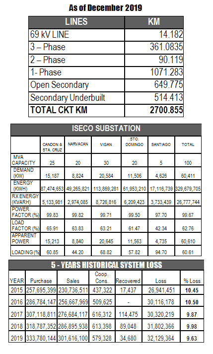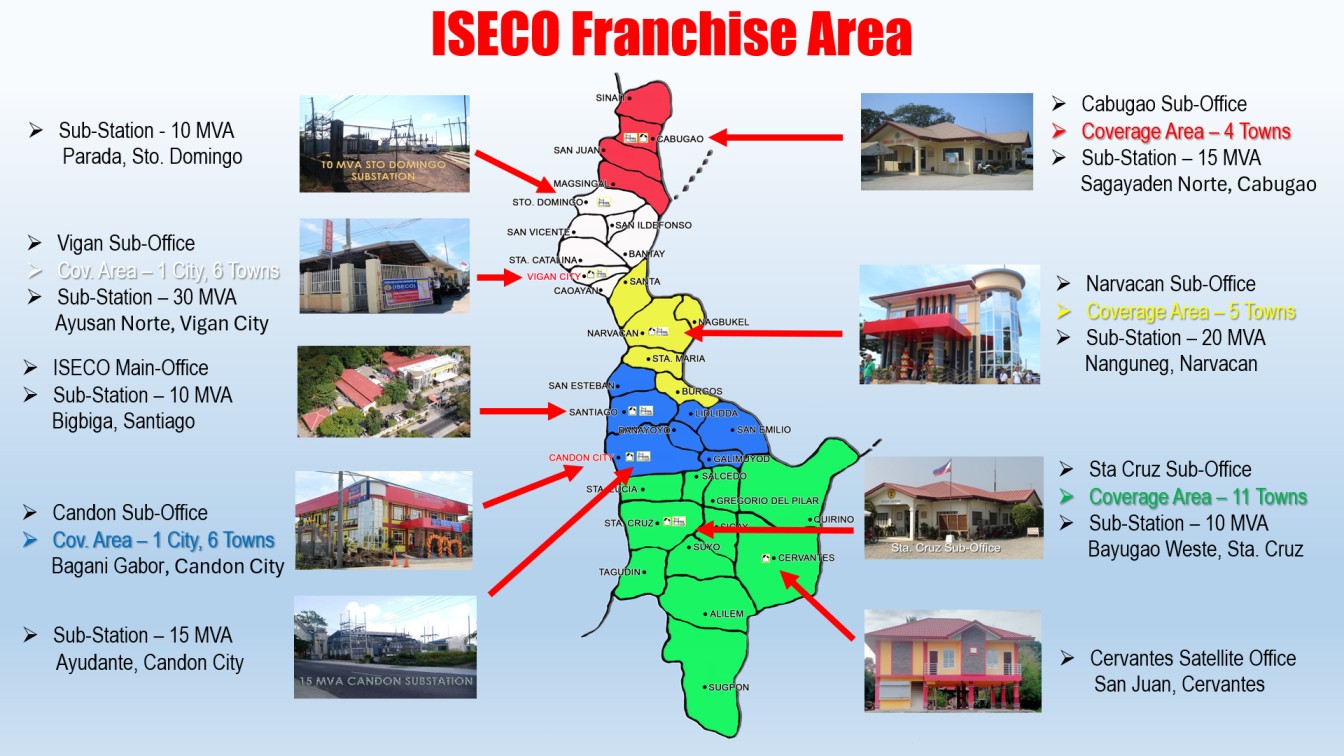 ISECO is an electric distribution utility with franchise area covering the whole province of Ilocos Sur with 32 municipalities and 2 cities namely: Alilem, Banayoyo, Bantay, Burgos, Cabugao, Caoayan, Cervantesm Galimuyod, G. Del Pilar, Lidlidda, Magsingal, Nagbukel, Narvacan, Quirino, San Emilio, San Esteban, San Emilio, San Ildefonso, San Juan, San Vicente, Santa, Santiago, Salcedo, Sigay, Sinait, Sta. Catalina, Sta, Cruz, Sta. Maria, Sta. Lucia, Sto. Domingo, Sugpon, Suyo, Tagudin, Vigan City and Candon City.